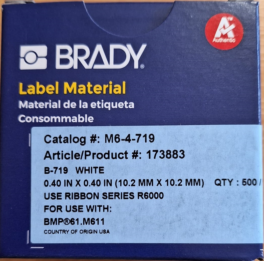 De BRADY PTL-4-719 is een voorgesneden label voor de printerreeks BMP61; M610; BMP71 (met labelrolgeleider); M710 (met labelrolgeleider); M611. De tape heeft een afmeting van 10,16 mm (B) x 10,16 mm (H).
