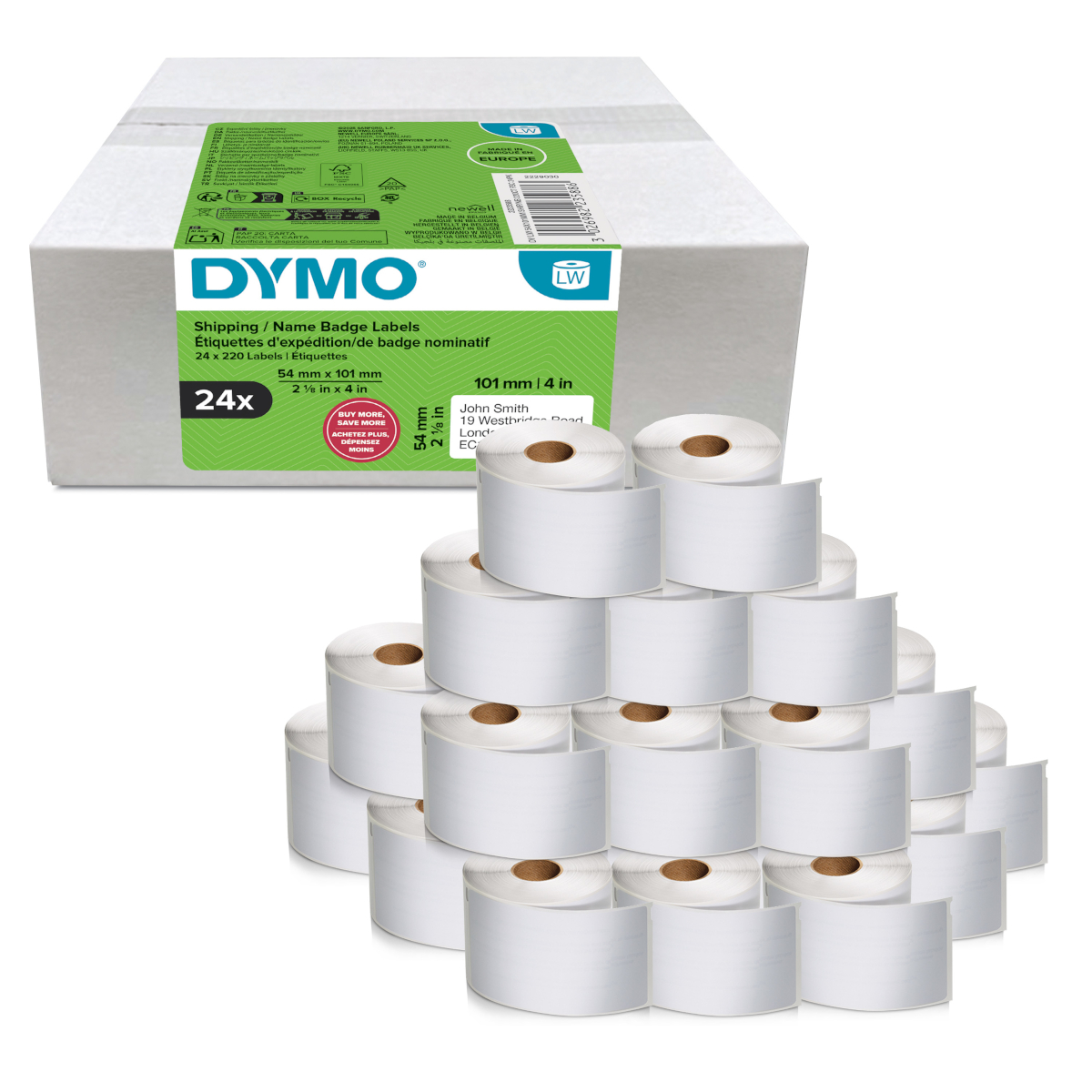 Als u veel verzendetiketten of naambadge-etiketten nodig heeft bent u veel voordeliger uit met een bulkverpakking. Deze groot verpakking bevat 24 rollen met originele DYMO etiketten voor de LabelWriter 400, 450 en 550 serie.