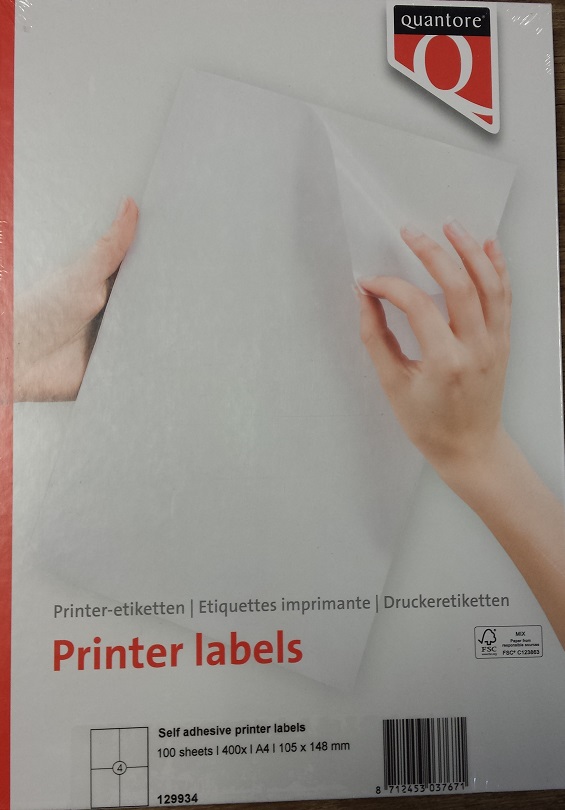 De doos bevat 100 vel A4 formaat met elk 4 A6 etiketten.