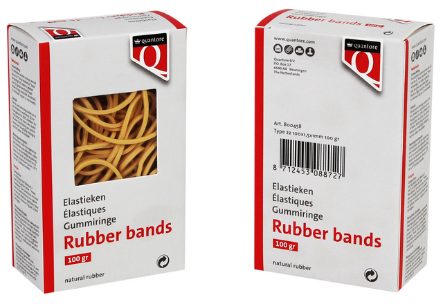 - De elastiekjes van Quantore zijn een betrouwbare en milieuvriendelijke oplossing voor het bundelen, ordenen en vastzetten van documenten of voorwerpen. Deze bruine elastieken in maat 22 hebben een afmeting van 100x1,5x1mm en worden geleverd in een handige doos van 100 gram. Ze zijn gemaakt van 80% pararubber en bieden uitstekende rekbaarheid en stevigheid. Ideaal voor gebruik op kantoor, op school of thuis.Kenmerken: