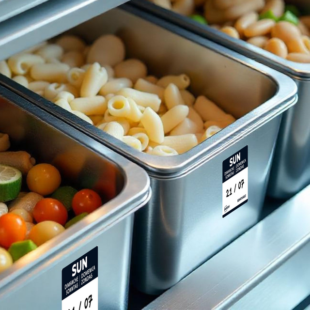 Gekleurde voedsel-dagetiketten zijn essentieel voor efficiënt voorraadbeheer in de horeca. Ze maken het mogelijk om de bereidings- of openingsdatum van voedsel nauwkeurig te volgen. Dankzij een kleurcode per dag identificeert men in één oogopslag de producten die met voorrang gebruikt moeten worden. Dit helpt voedselverspilling te beperken en zorgt voor een optimaal voedselgebruik. Met deze labels voldoet men aan de HACCP-normen en vergemakkelijkt men de controle van de houdbaarheidsdatum. Dankzij de afneembare lijm zijn ze eenvoudig aan te brengen en te verwijderen. Ze kunnen worden gebruikt op alle soorten verpakkingen. In de keuken verbeteren ze de communicatie tussen teams door verwarring over de versheid van de producten te voorkomen. Het gebruik van daglabels betekent dagelijks tijd besparen en tegelijkertijd servicekwaliteit garanderen. Door te investeren in dit efficiënte etiketteringssysteem optimaliseren horeca-eigenaren zowel hun organisatie als hun winstgevendheid.