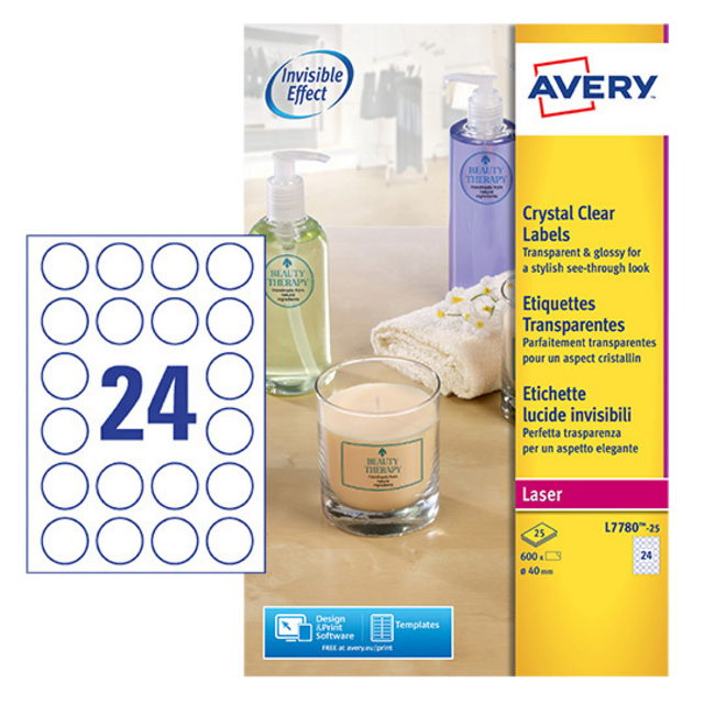 Eigenschappen "Etiket Avery L7780-25 rond 40mm transparant 600 etiketten"