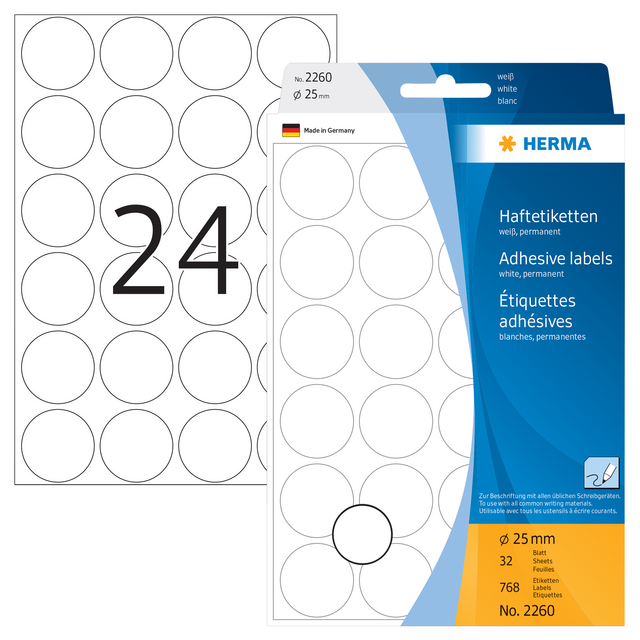 Eigenschappen "Etiket HERMA 2260 rond 25mm wit 768stuks"