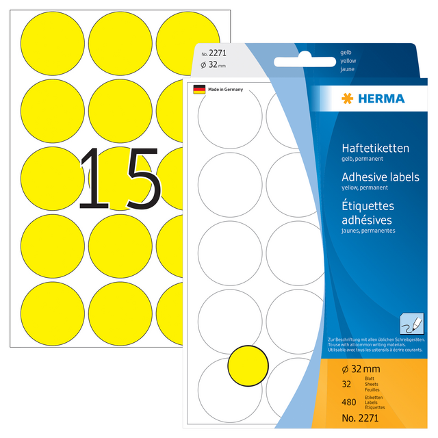 Eigenschappen "Etiket HERMA 2271 rond 32mm geel 480stuks"
