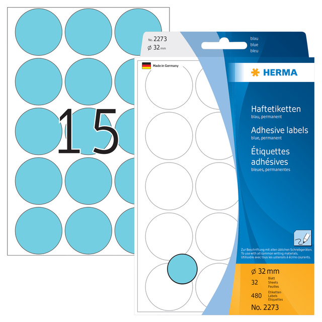 Eigenschappen "Etiket HERMA 2273 rond 32mm blauw 480stuks"