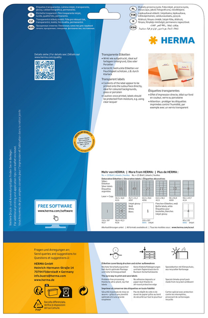 Eigenschappen "Etiket HERMA 8964 210x297mm transparant glanzend 10stuks"