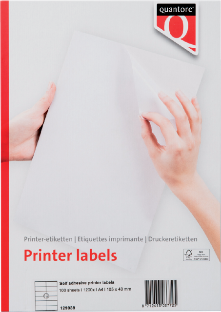 - De etiketten Quantore 105x48mm 1200 stuks zijn ideaal voor diverse toepassingen waarbij duidelijke, duurzame labeling essentieel is. Deze zelfklevende etiketten op A4-vellen zijn geschikt voor gebruik met inkjet-, laser- en matrixprinters, evenals kopieerapparaten. Ze zijn gemaakt van 70 grams chloorvrij gebleekt etikettenpapier en voorzien van een 60 grams siliconenrug. De oplosmiddelvrije lijm op acrylaatbasis garandeert een uitstekende hechting op verschillende oppervlakken. Bestand tegen temperaturen van -30°C tot +70°C, met een piekbelasting tot 200°C. FSC-gecertificeerd en dus verantwoord geproduceerd.Kenmerken: