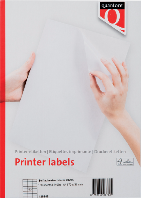 - De etiketten Quantore 70x37mm 2400 stuks bieden een betrouwbare oplossing voor het professioneel labelen van documenten, verpakkingen en producten. Deze zelfklevende etiketten worden geleverd op A4-vellen en zijn geschikt voor gebruik met inkjet-, laser- en matrixprinters, evenals kopieerapparaten. Ze zijn gemaakt van 70 grams chloorvrij gebleekt etikettenpapier met een 60 grams siliconenrug, wat zorgt voor een soepele verwerking. De oplosmiddelvrije lijm op acrylaatbasis zorgt voor een sterke hechting. Bestand tegen temperaturen van -30°C tot +70°C, met piekbelasting tot 200°C. FSC-gecertificeerd, dus een milieubewuste keuze.Kenmerken: