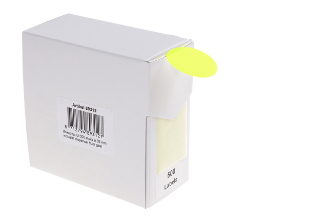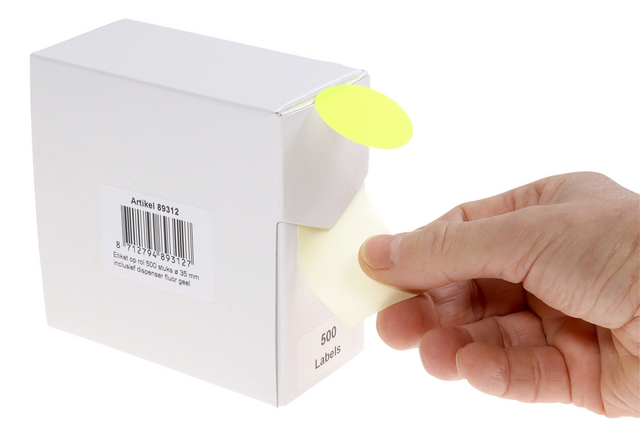 - Fluor gele ronde etiketten in kartonnen dispenser.
