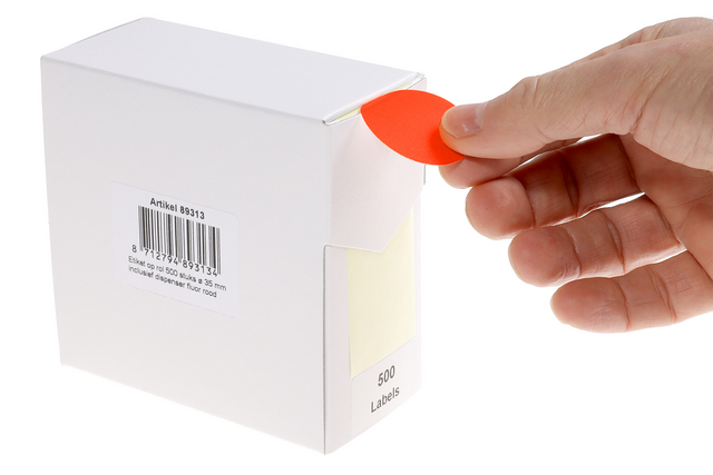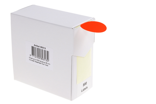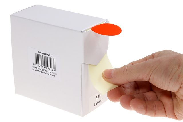 - Fluor rode ronde etiketten in kartonnen dispenser.