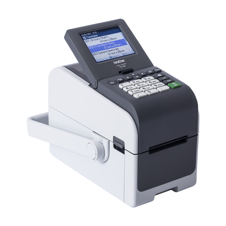 Productinformatie "TD-2350DSAH300 Professionele labelprinter (wit/grijs), Handgreep, Direct thermisch, LCD touchscreen, 15 tot 63mm labelbreedte, 300 dpi"