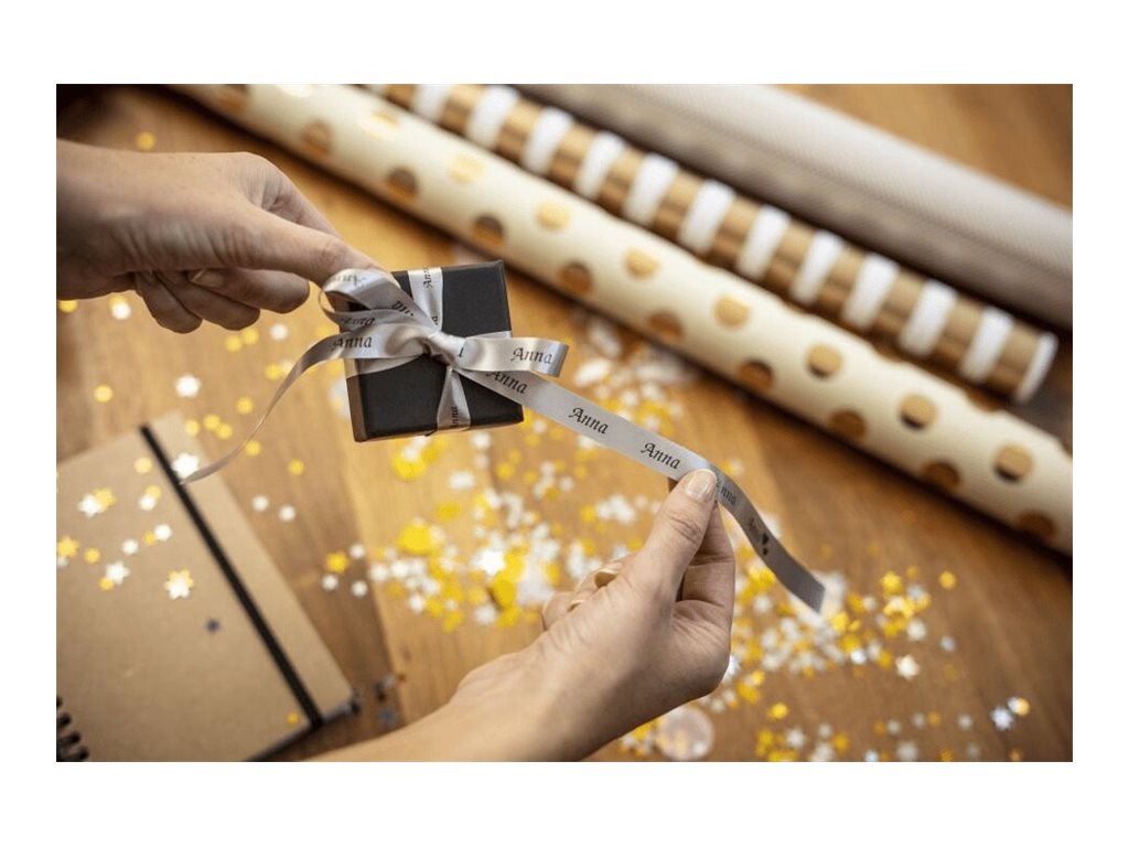 Met de TZe-R931 maakt u snel stijlvolle linten met scherpe, professionele opdruk. Dit prachtige zwart op zilver premium lint heeft dankzij de glanzende afwerking een mooie, luxe uitstraling en is perfect geschikt voor het inpakken van belangrijke cadeautjes en bijzondere hobbyprojecten.