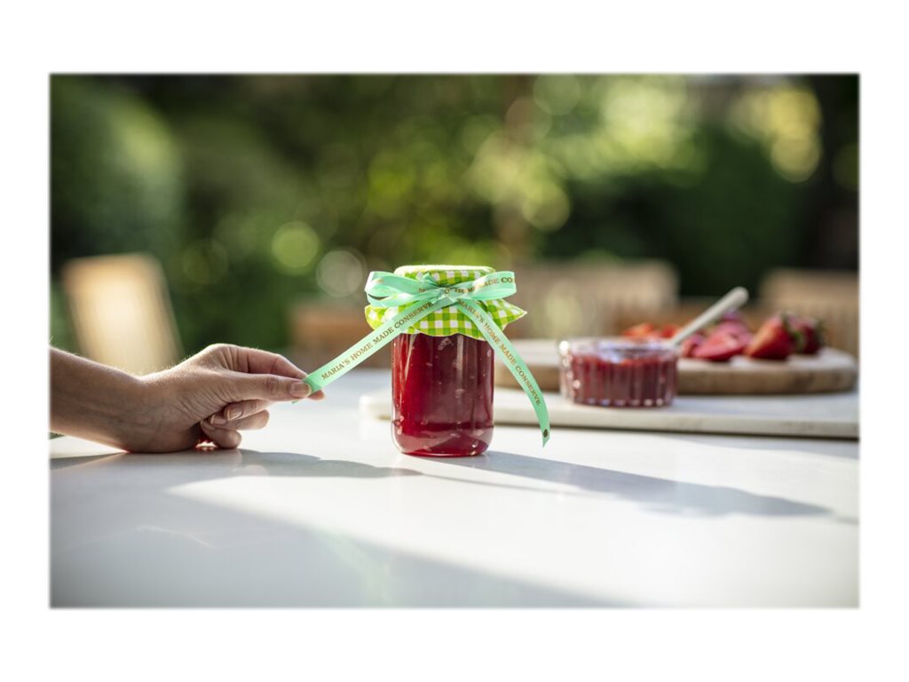 Met de TZe-RM54 maakt u snel stijlvolle linten met scherpe, professionele opdruk. Dit prachtige goud op mintgroen premium lint heeft dankzij de glanzende afwerking een mooie, luxe uitstraling en is perfect geschikt voor het inpakken van belangrijke cadeautjes en bijzondere hobbyprojecten.