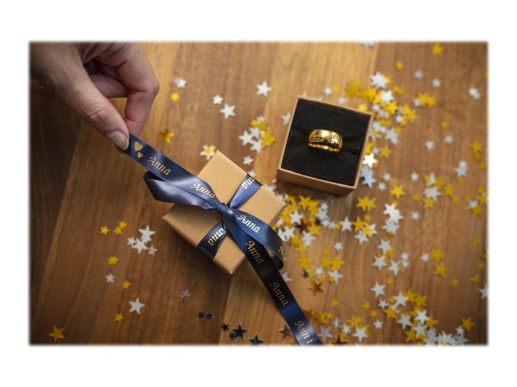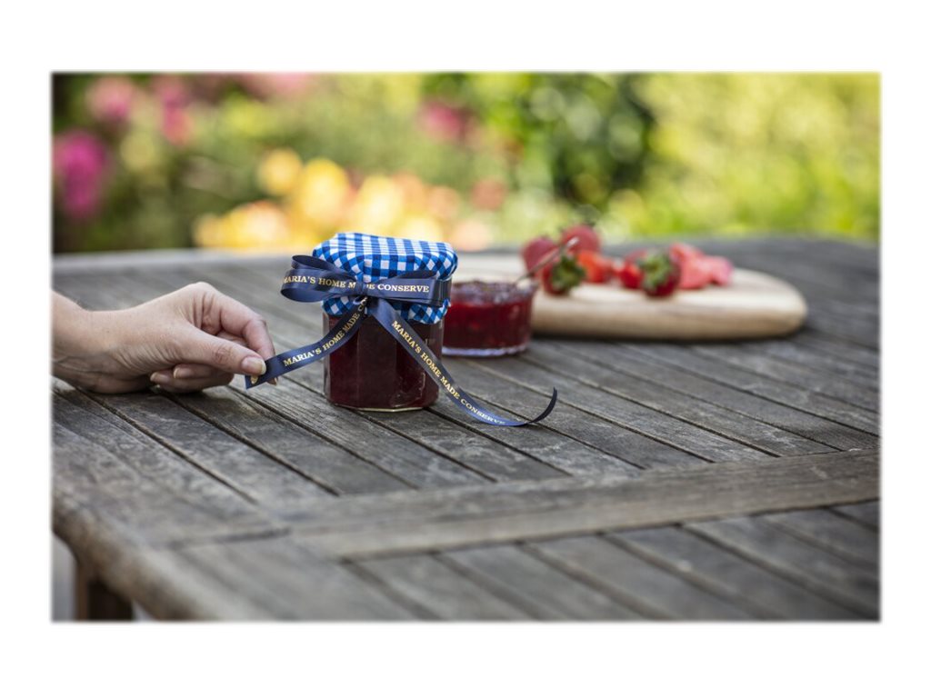 Met de TZe-RN34 maakt u snel stijlvolle linten met scherpe, professionele opdruk. Dit prachtige goud op marineblauwe premium lint heeft dankzij de glanzende afwerking een mooie, luxe uitstraling en is perfect geschikt voor het inpakken van belangrijke cadeautjes en bijzondere hobbyprojecten.