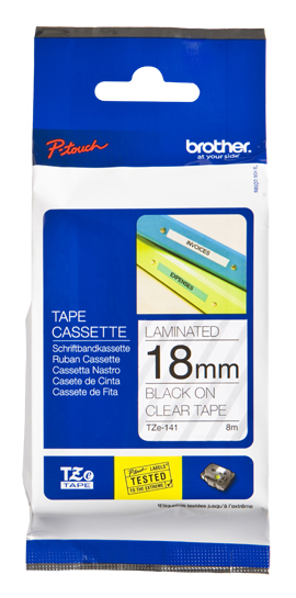 De TZe-141 lettertape van Brother is een 18mm brede gelamineerde lettertape. De tape is transparant en heeft een zwarte opdruk (tekst en afbeeldingen). Deze 18mm brede tape past in veel Brother P-touch labelmakers. Zie het tabblad Extra Informatie voor de lijst van geschikte labelmakers.