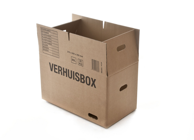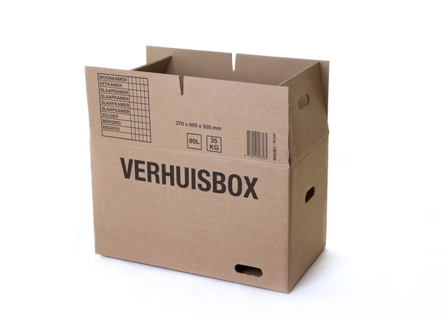 - De bruine verhuisdoos kan met een maximum gewicht van 20kg beladen worden. Afmeting van de doos is 370x650x350mm.