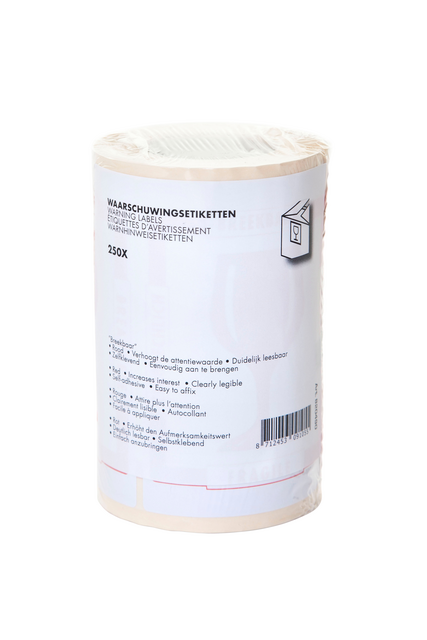 - Het waarschuwingsetiket IEZZY breekbaar 80mmx100m is dé oplossing om breekbare zendingen direct herkenbaar te maken. Met een opvallende rode kleur en duidelijke waarschuwingstekst in vier talen trek je onmiddellijk de aandacht van transporteurs en magazijnmedewerkers. Ideaal voor het markeren en beveiligen van kwetsbare goederen tijdens opslag en vervoer. De etiketten zijn gemaakt van stevig papier en zitten op een handige rol met 250 stuks, wat zorgt voor snel en efficiënt gebruik in elke logistieke omgeving.Kenmerken: